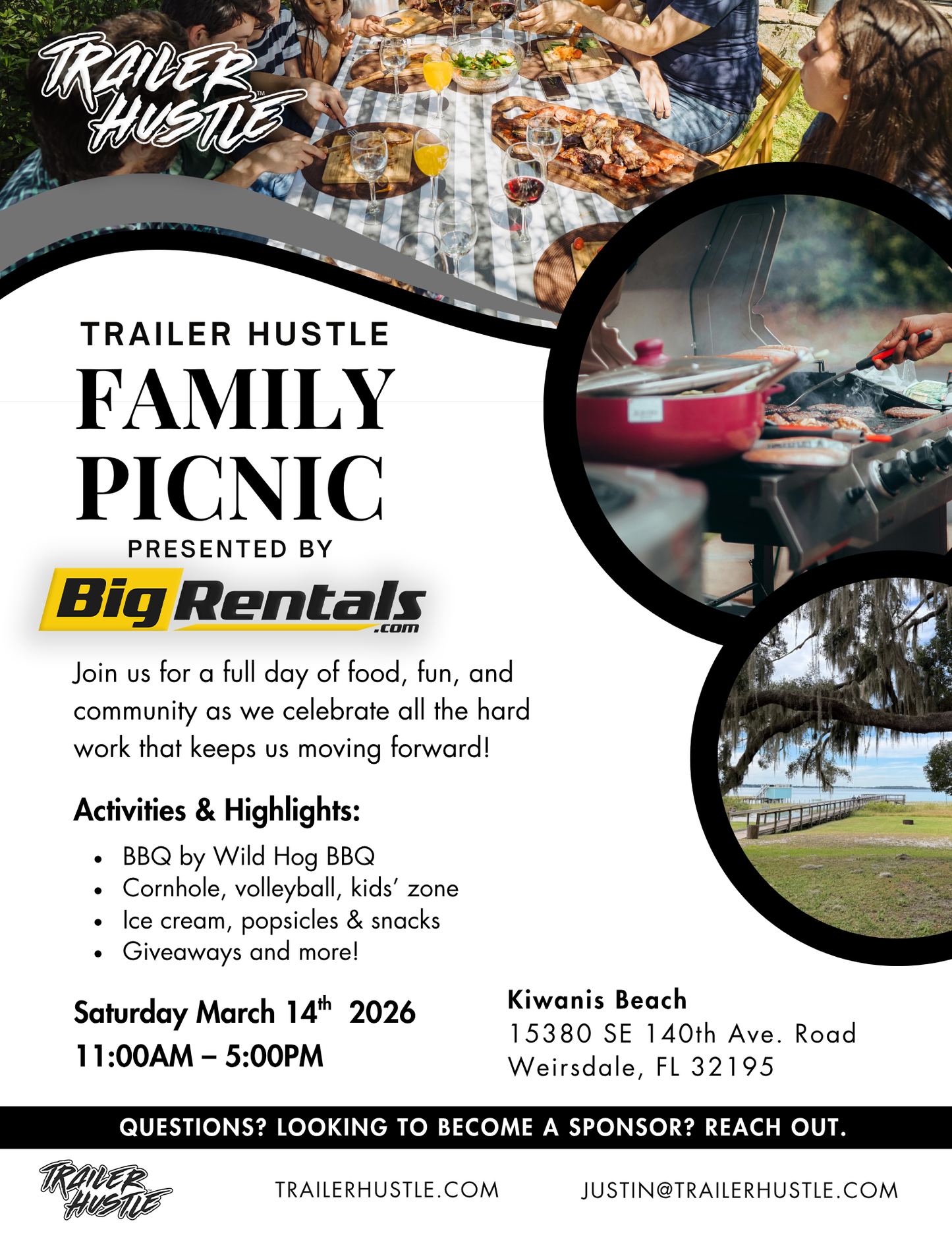 Join us for the first-ever Trailer Hustle Picnic, brought to you by Big Rentals — a laid-back, family-friendly day for you, your spouse, and the kids. Enjoy food, games, giveaways, networking, and good vibes with the Trailer Hustle community. Come hang out, meet other owners, connect with industry brands, and make a day of it together. RSVP to save your spot.